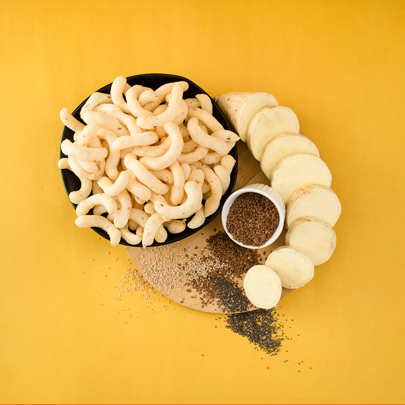 Batata-doce, polvilho azedo, óleo de milho, gergelim, chia,