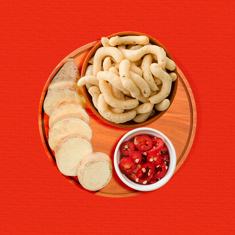 Batata-doce, polvilho azedo, óleo de milho, orégano, cebola, cheiro-verde, pimenta calabresa seca e sal marinho