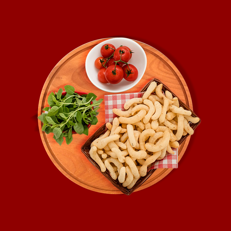 Batata-doce, polvilho azedo, óleo de milho, tomate seco, manjericão e sal marinho.